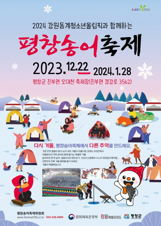송어 얼음낚시를 주제로 1급 청정수 오대천에서 열리는 2024 평창 송어 축제는 2007년 첫 개최 이후 해를 거듭하며 인기를 더해 매년 50만 명 이상이 찾는 대표 겨울 축제예요!